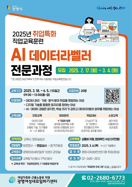 한편, 광명여성새로일하기센터는 AI 데이터라벨러 과정 외에도 ‘공동주택 ERP 사무원’, ‘현장맞춤형 사회복지사 양성과정’, ‘정리수납 매니저’ 등 다양한 직업교육훈련을 운영할 예정이다.